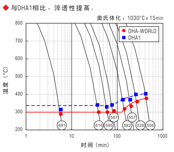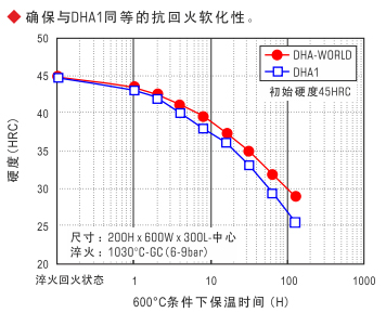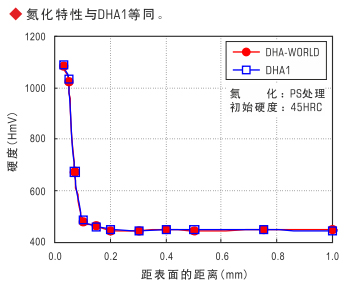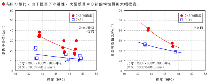優(yōu)異的淬透性…通過對DHA1(JIS-SKD61相當)成分最優(yōu)化設計,大幅改善了淬透性,熱處理操作容易,大型模具中心部也可以獲得高韌性。